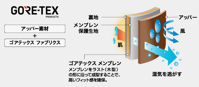 世界最高レベルの防水透湿性素材「ゴアテックス® ファブリクス」にモデルごとに異なるアッパー素材を組み合わせています。